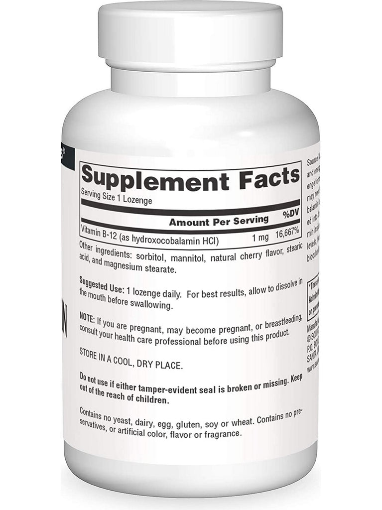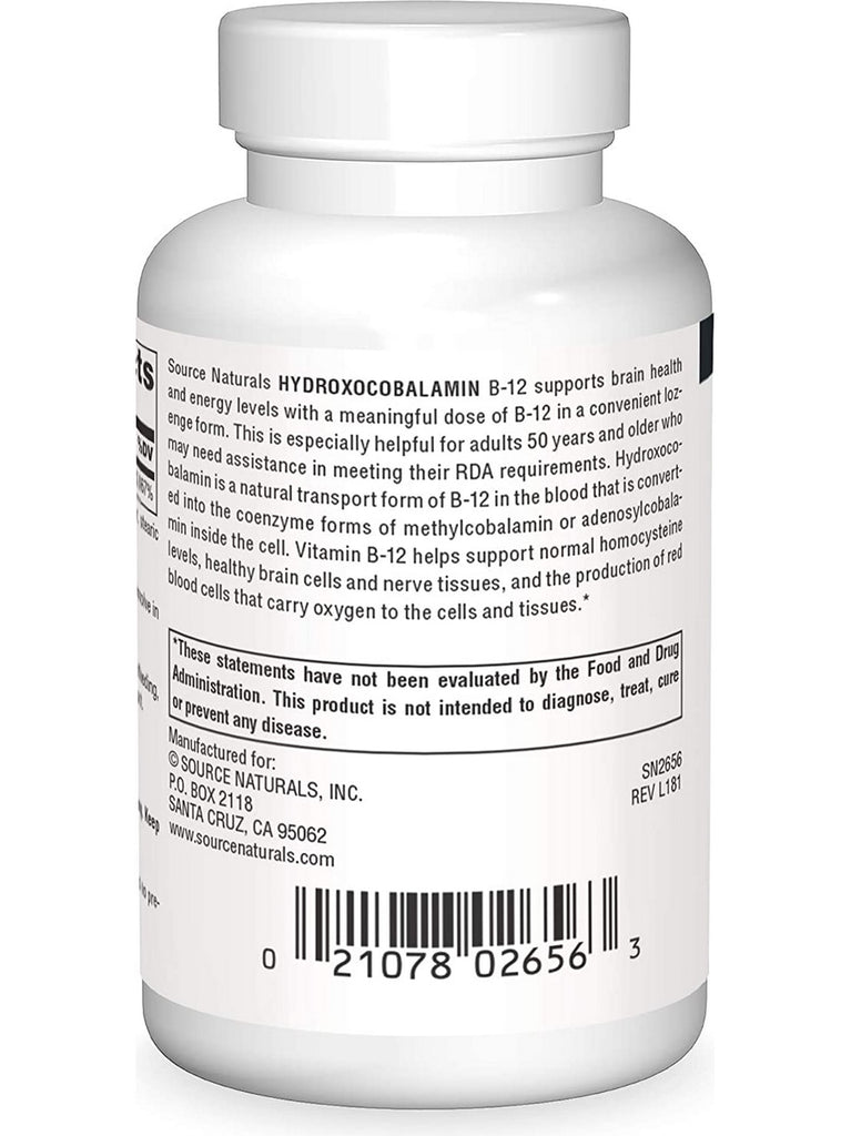 Source Naturals Hydroxocobalamin B-12 supports brain health and energy levels with a meaningful dose of B-12 in a convenient lozenge form. This is especially helpful for adults 50 years and older who may need assistance in meeting their RDA requirements. Hydroxocobalamin is a natural transport form of B-12 in the blood that is converted into the coenzyme forms of methylcobalamin or adenosylcobalamin inside the cell. Vitamin B-12 helps support normal homocysteine levels, healthy brain cells and nerve tissues, and the production of red blood cells that carry oxygen to the cells and tissues.