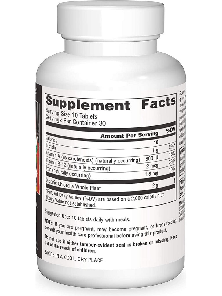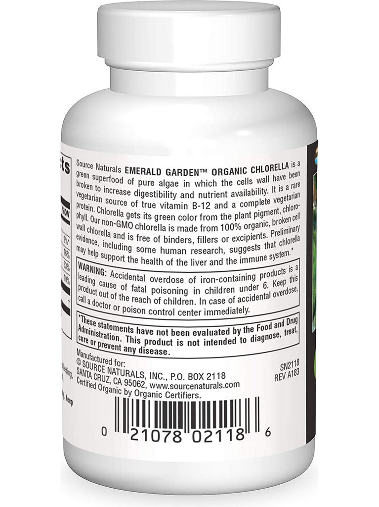 Source Naturals Emerald Garden™ Organic Chlorella is a green superfood of pure algae in which the cells wall have been broken to increase digestibility and nutrient availability. It is a rare vegetarian source of true vitamin B-12 and a complete vegetarian protein. Chlorella gets its green color from the plant pigment, chlorophyll. Our non-GMO chlorella is made from 100% organic, broken cell wall chlorella and is free of binders, fillers or excipients. Preliminary evidence, including some human research, suggests that chlorella may help support the health of the liver and the immune system.