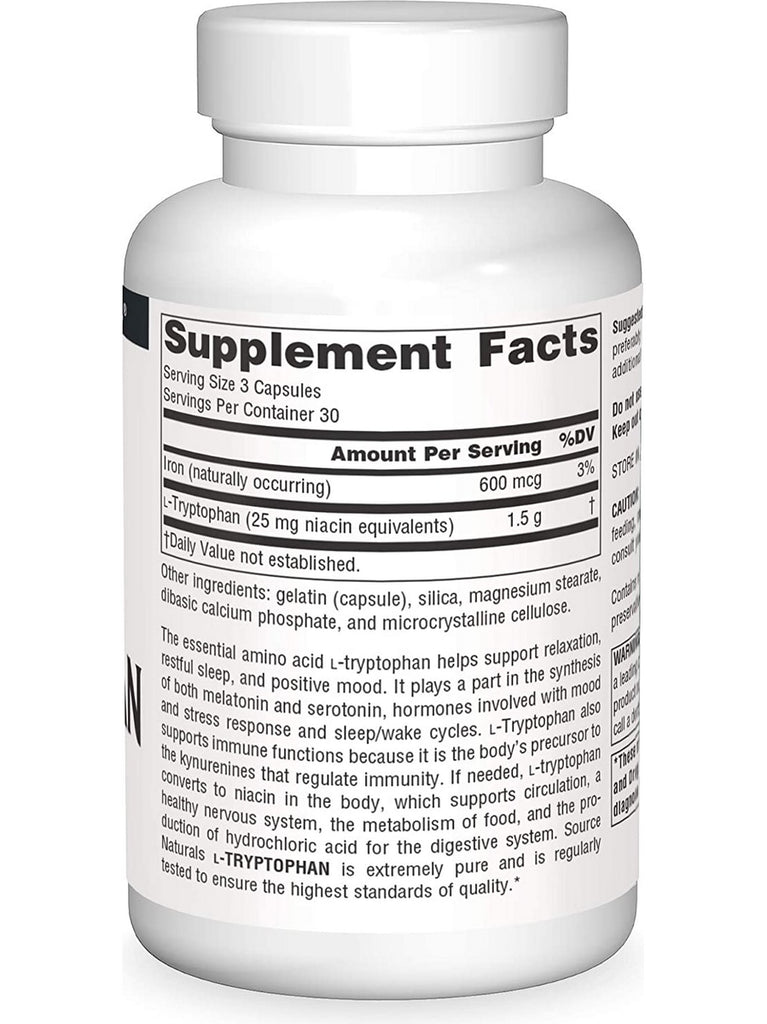 The essential amino acid l-tryptophan helps support relaxation, restful sleep, and positive mood. It plays a part in the synthesis of both melatonin and serotonin, hormones involved with mood and stress response and sleep/wake cycles. l-Tryptophan also supports immune functions because it is the body’s precursor to the kynurenines that regulate immunity. If needed, l-tryptophan converts to niacin in the body, which supports circulation, a healthy nervous system, the metabolism of food, and the production of hydrochloric acid for the digestive system. Source Naturals l-TRYPTOPHAN is extremely pure and is regularly tested to ensure the highest standards of quality.