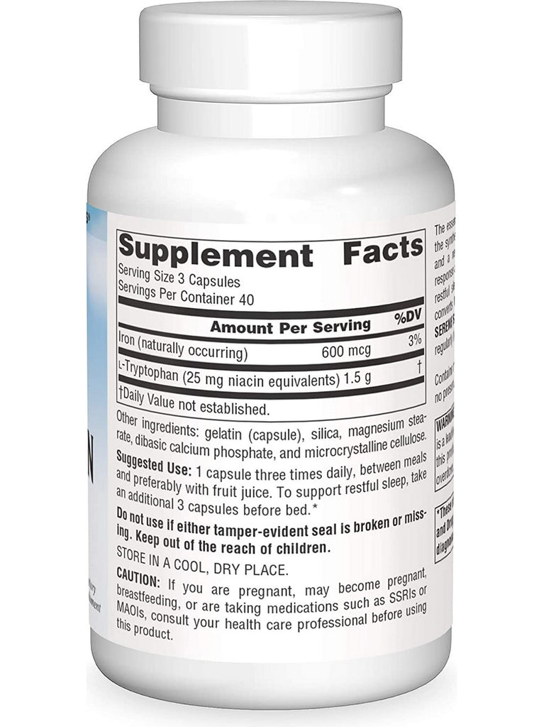 The essential amino acid l-tryptophan is the precursor for the synthesis of both melatonin and serotonin, a hormone and a neurotransmitter involved with mood and stress response and sleep/wake cycles. It helps support relaxation, restful sleep, and positive mood. If needed, l-tryptophan converts to niacin in the body, an important B vitamin. SERENE SCIENCE® L-TRYPTOPHAN is extremely pure and is regularly tested to ensure the highest standards of quality.