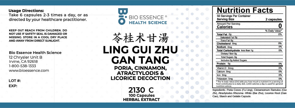 Bio Essence Health Science, Ling Gui Zhu Gan Tang, Poria, Cinnamon, Atractylodis & Licorice Decoction, 100 Capsules