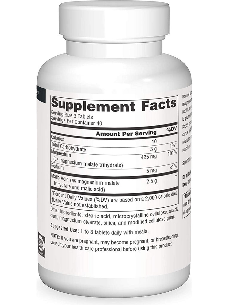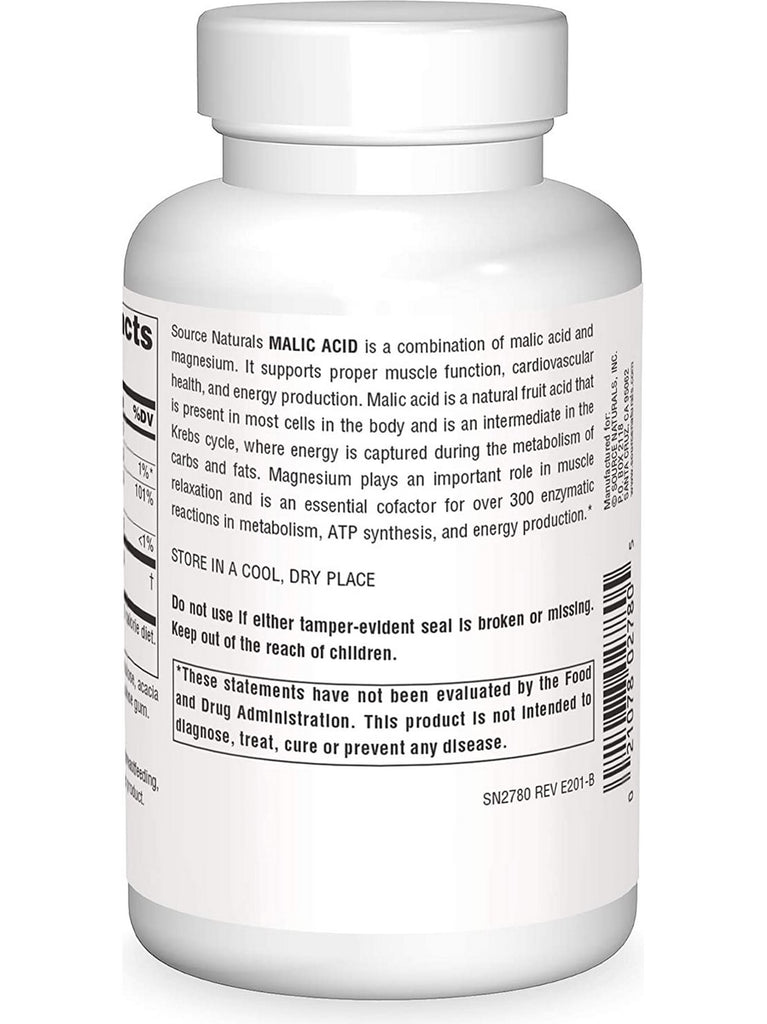 Source Naturals Malic Acid is a combination of malic acid and magnesium. It supports proper muscle function, cardiovascular health, and energy production. Malic acid is a natural fruit acid that is present in most cells in the body and is an intermediate in the Krebs cycle, where energy is captured during the metabolism of carbs and fats. Magnesium plays an important role in muscle relaxation and is an essential cofactor for over 300 enzymatic reactions in metabolism, ATP synthesis, and energy production.