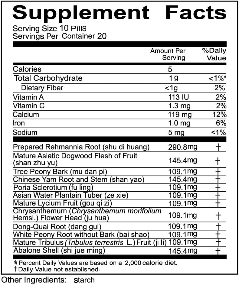 Prepared Rehmannia Root, Mature Asiatic Dogwood Flesh or Fruit, Tree Peony Bark, Chinese Yam Root and Stem, Poria Sclerotium, Asian Water Plantain Tuber, Mature Lycium Fruit, Chrysanthemum Flower Head., Dong-quai Root, White Peony Root Without Bark, Mature Tribulus Fruit, Abalone Shell, and Starch.