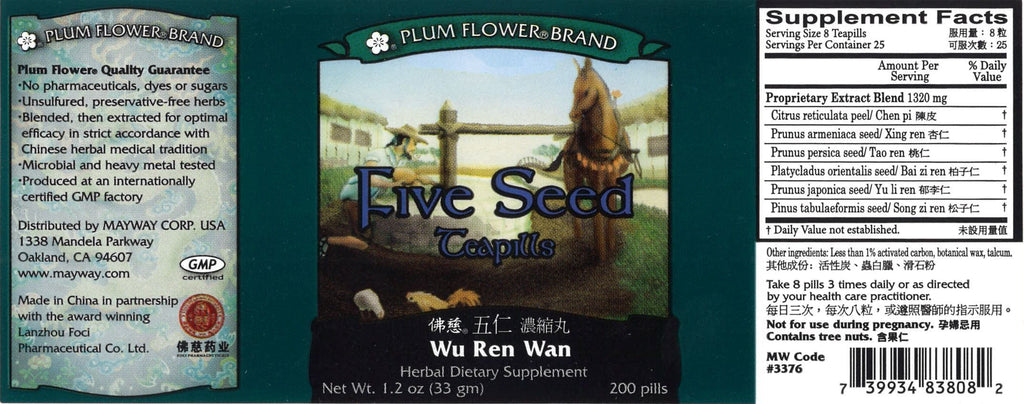 Five Seed product (wu ren wan) is an all-natural, fiber-based Chinese herbal formula Used to moisten the intestines and encourage the downward movement of digestion.