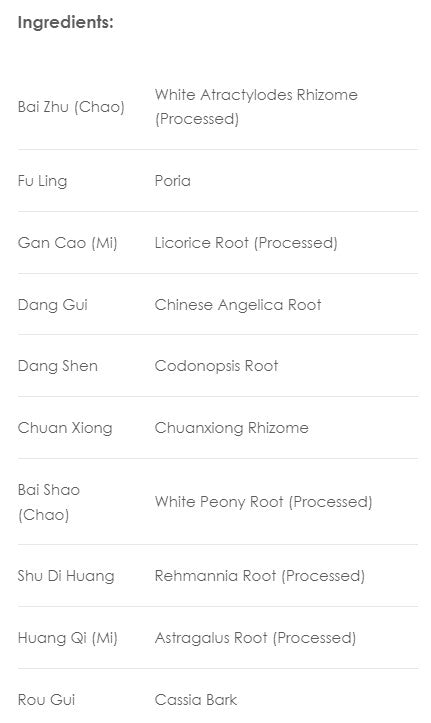 Bai Zhu (Chao) (White Atractylodes Rhizome (Processed)), Fu Ling (Poria), Gan Cao (Mi) (Licorice Root (Processed)), Dang Gui (Chinese Angelica Root), Dang Shen (Codonopsis Root), Chuan Xiong (Chuanxiong Rhizome), Bai Shao (Chao) (White Peony Root (Processed)), Shu Di Huang (Rehmannia Root (Processed)), Huang Qi (Mi) (Astragalus Root (Processed)), Rou Gui (Cassia Bark).