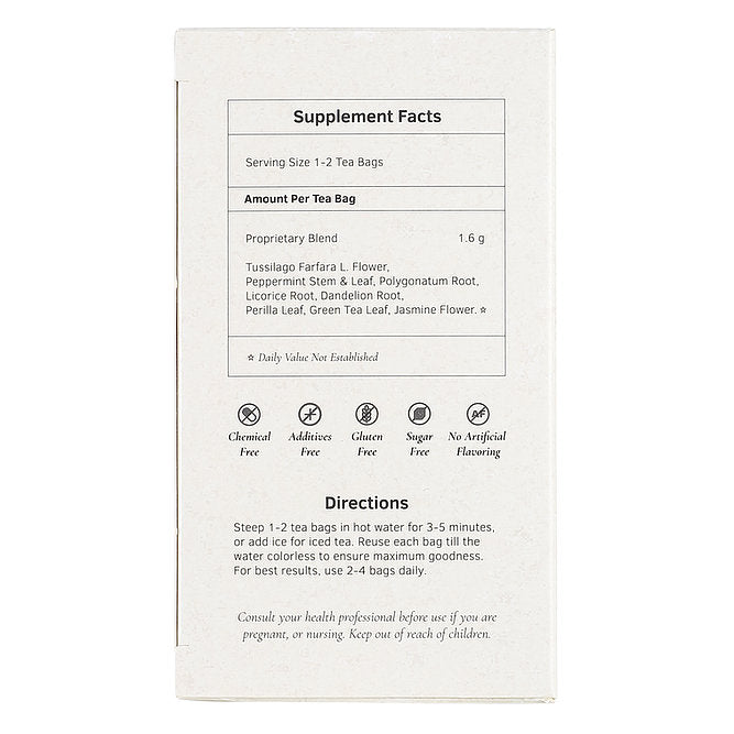 Tussilago Farfara L. Flower, Peppermint Stem & Leaf, Polygonatum Root, Licorice Root, Dandelion Root, Perilla Leaf, Green Tea Leaf, Jasmine Flower.