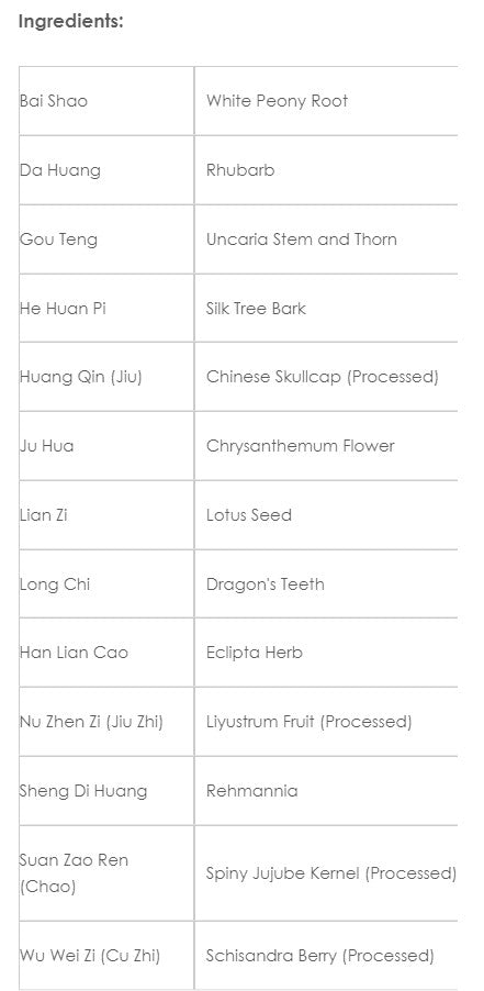 Bai Shao (White Peony Root), Da Huang (Rhubarb), Gou Teng (Uncaria Stem and Thorn), He Huan Pi (Silk Tree Bark), Huang Qin (Jiu) (Chinese Skullcap (Processed)), Ju Hua (Chrysanthemum Flower), Lian Zi (Lotus Seed), Long Chi (Dragon's Teeth), Han Lian Cao (Eclipta Herb), Nu Zhen Zi (Jiu Zhi) (Liyustrum Fruit (Processed)), (Sheng Di Huang Rehmannia), Suan Zao Ren (Chao) (Spiny Jujube Kernel (Processed)), Wu Wei Zi (Cu Zhi (Schisandra Berry (Processed)).