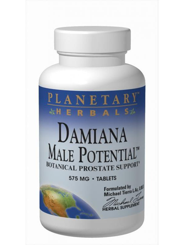 Planetary Herbals Damiana Male Potential combines renowned strengthening tonifiers and herbs that help support the prostate. Ginseng is legendary for its strengthening qualities, while saw palmetto has been the subject of numerous studies for its positive benefit on the prostate. These two botanicals are combined with damiana (Turnera aphrodisiaca) and supporting herbs create a comprehensive botanical supplement for men.