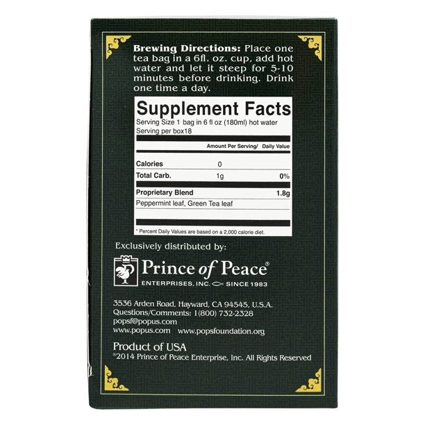 Prince of Peace® Peppermint Green Teawas developed by experts specialize in traditional Chinese supplement. It’s made from high quality herbs includingPeppermint which brings refreshing and uplifting herbal tea experience.