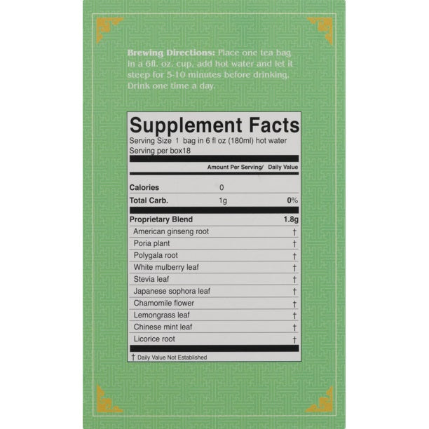 Enjoy a cup of Prince of Peace® Relax Tea to soothe and refresh your mind. Polygala root and Poria plant helps to relieve stress and anxiety. Chamomile ?ower promotes general relaxation and uplifts mood.