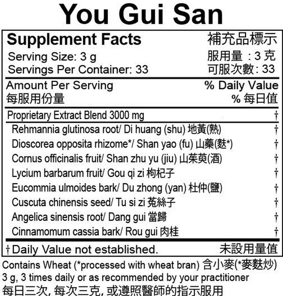 Rehmannia glutinosa root-prep, Dioscorea opposita rhizome, Cornus officinalis fruit, Lycium barbarum fruit, Eucommia ulmoides bark, Cuscuta chinensis seed, Angelica sinensis root, Cinnamomum cassia bark.