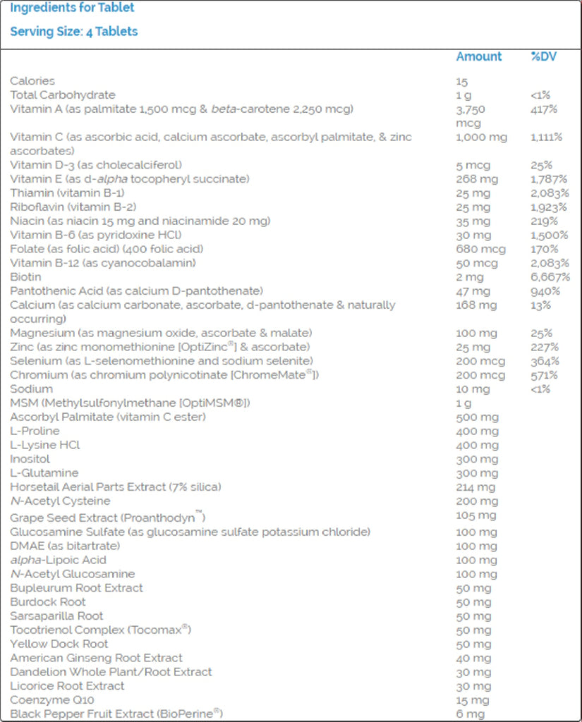 Vitamin C (as ascorbic acid, ascorbyl palmitate, and calcium, magnesium, and zinc ascorbates), 1,000 mg