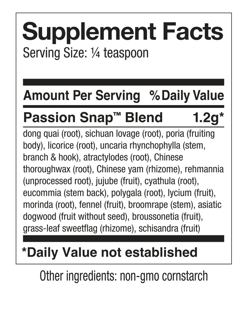 Are lack of desire, mood swings, lack of energy or motivation preventing you from living life to its fullest?It doesn't have to be so heavy! Passion Snap moves your Liver Qi, opening up the opportunity to navigate life with more passion, energy and excitement. Support sustained, balanced energy and find more pleasure in your day-to-day life.Passion Snap is contraindicated during pregnancy due to its blood-moving action.