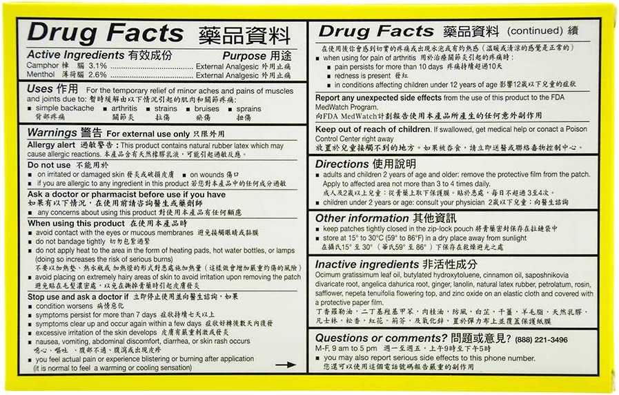 Extra Strength Hua Tuo Medicated Patch is effective for temporarily relief of various minor aches and pains of muscles and joints including: minor backache, strains, bruises and sprains.