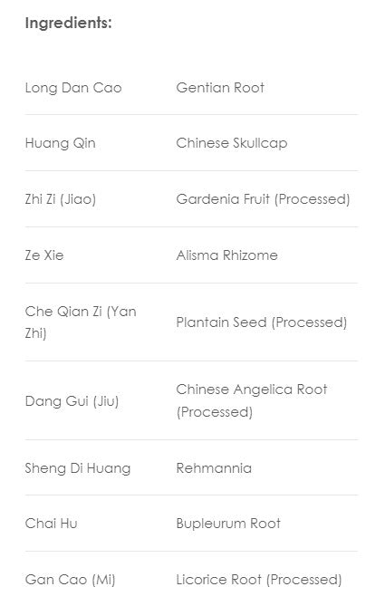 Long Dan Cao (Gentian Root), Huang Qin (Chinese Skullcap), Zhi Zi (Jiao) (Gardenia Fruit (Processed)), Ze Xie (Alisma Rhizome), Che Qian Zi (Yan Zhi) (Plantain Seed (Processed)), Dang Gui (Jiu) (Chinese Angelica Root (Processed)), Sheng Di Huang (Rehmannia), Chai Hu (Bupleurum Root), Gan Cao (Mi) (Licorice Root (Processed)).