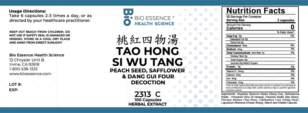Bio Essence Health Science, Tao Hong Si Wu Tang, Peach Seed, Safflower & Dong Gui Four Decoction, 100 Capsules