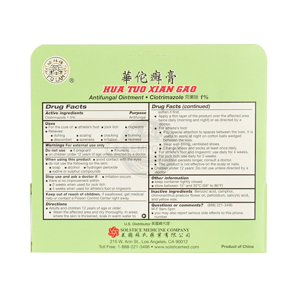 Hua Tuo Xian Gao Antifungal Ointment cure athlete's foot, jock itch & ringworm. Relieves itching, scaling, cracking, burning, discomfort, soreness, irritation & redness.