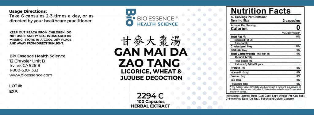 Bio Essence Health Science, Gan Mai Da Zao Tang, Licorice, Wheat & Jujube Decoction, 100 Capsules