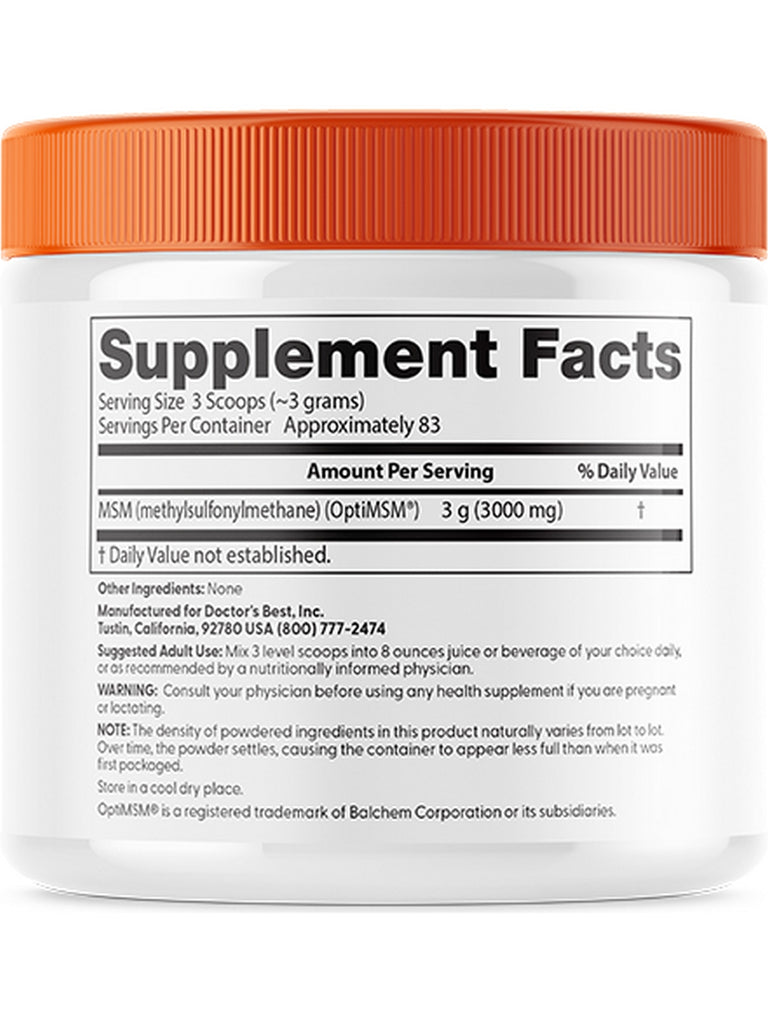Best MSM supplies pure crystalline MSM (methylsulfonylmethane), a naturally-occuring source of organic sulfur that is easily absorbed and used by the body. Taken up from the soil by plants, MSM found in foods is largely lost during food processing, storage and cooking.