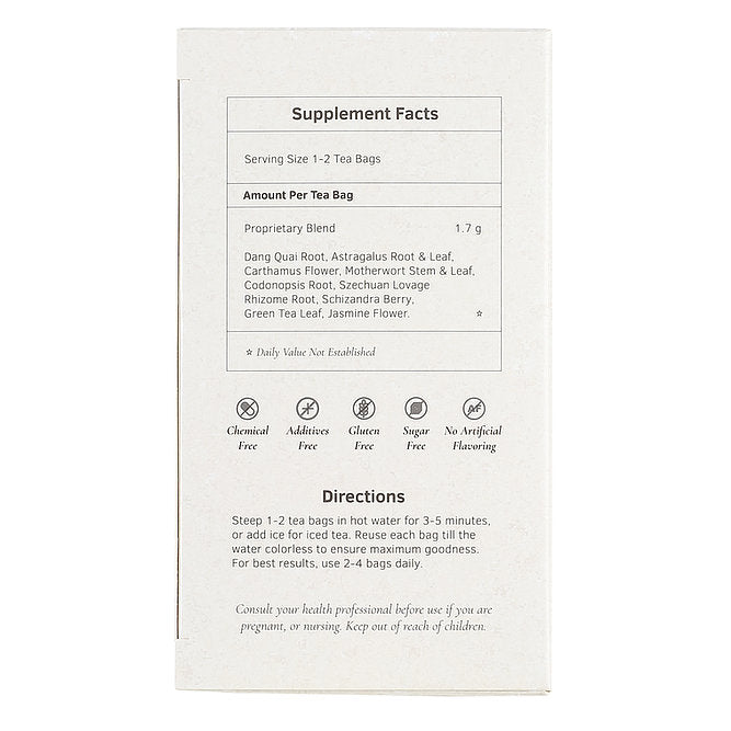 Dong Quai Root, Astragalus Root & Leaf, Carthamus Flower, Motherwort Stem & Leaf, Codonopsis Root, Szechuan Lovage Rhizome Root, Schizandra Berry, Green Tea Leaf, Jasmine Flower.