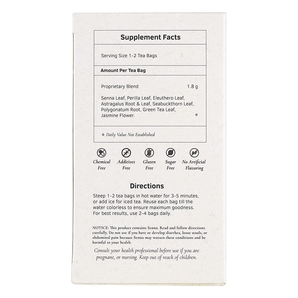 Senna Leaf, Perilla Leaf, Eleuthero Leaf, Astragalus Root & Leaf, Seabuckthorn Leaf, Polygonatum Root, Green Tea Leaf, Jasmine Flower.