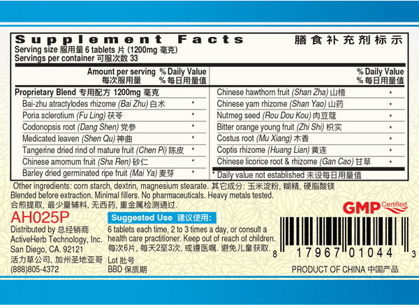 A proprietary blend of: Rhizoma Atractylodis Macrocephalae (Bai Zhu), Radix Aucklandiae Lappae (Mu Xiang), Rhizoma Coptidis Recens (Huang Lian), Radix Glycyrrhizae Uralensis (Gan Cao), Sclerotium Poriae Cocos (Fu Ling), Radix Codonopsis Pilosulae (Dang Shen), Massa Medicata Fermentata (Shen Qu), Pericarpium Citri Reticulatae (Chen Pi), Fructus Amomi (Sha Ren), Fructis Hordei Germinatus (Mai Ya), Fructus Crataegi (Shan Zha), Rhizoma Dioscoreae Oppositae (Shan Yao), Semen Myristicae Fragrantis (Rou Dou Kou), Fructus Aurantii Immaturus (Zhi Shi).