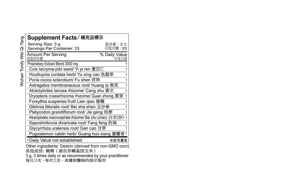 Wuhan Tonify Wei Qi Tang is comprised of 13 herbs designed as a prophylaxis formula for the preservation of health.