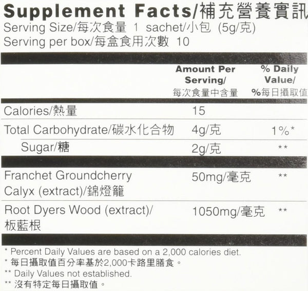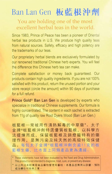 Prince of Peace Gold Ban Lan Gen is developed by experts who specialize in traditional Chinese supplements. Their formula is highly concentrated. The content in each sachet is extracted from 11g of quality raw Root Dyers Wood (Ban Lan Gen.)