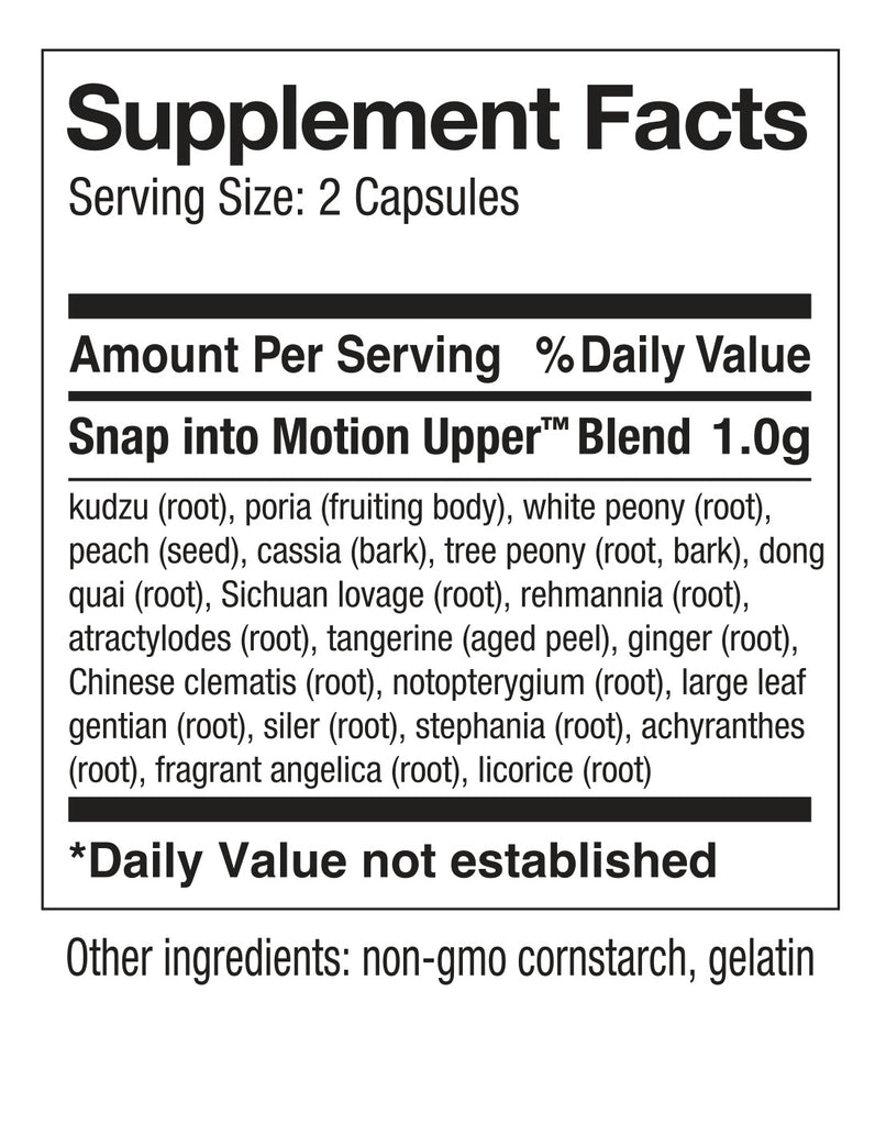 Want to move with more freedom? Snap Into Motion Upper supports circulation health above the waist including the neck, shoulders, elbows and hands. Unblock stagnation to allow the free flow of blood and chi. It is closely related to its companion product, Snap Into Motion Lower, with the addition of one herb which directs the action of the formula to the upper body. Snap Into Motion Upper is contraindicated during pregnancy due to the blood-moving action of the formula. Consult a healthcare professional if taking prescription blood thinners.
