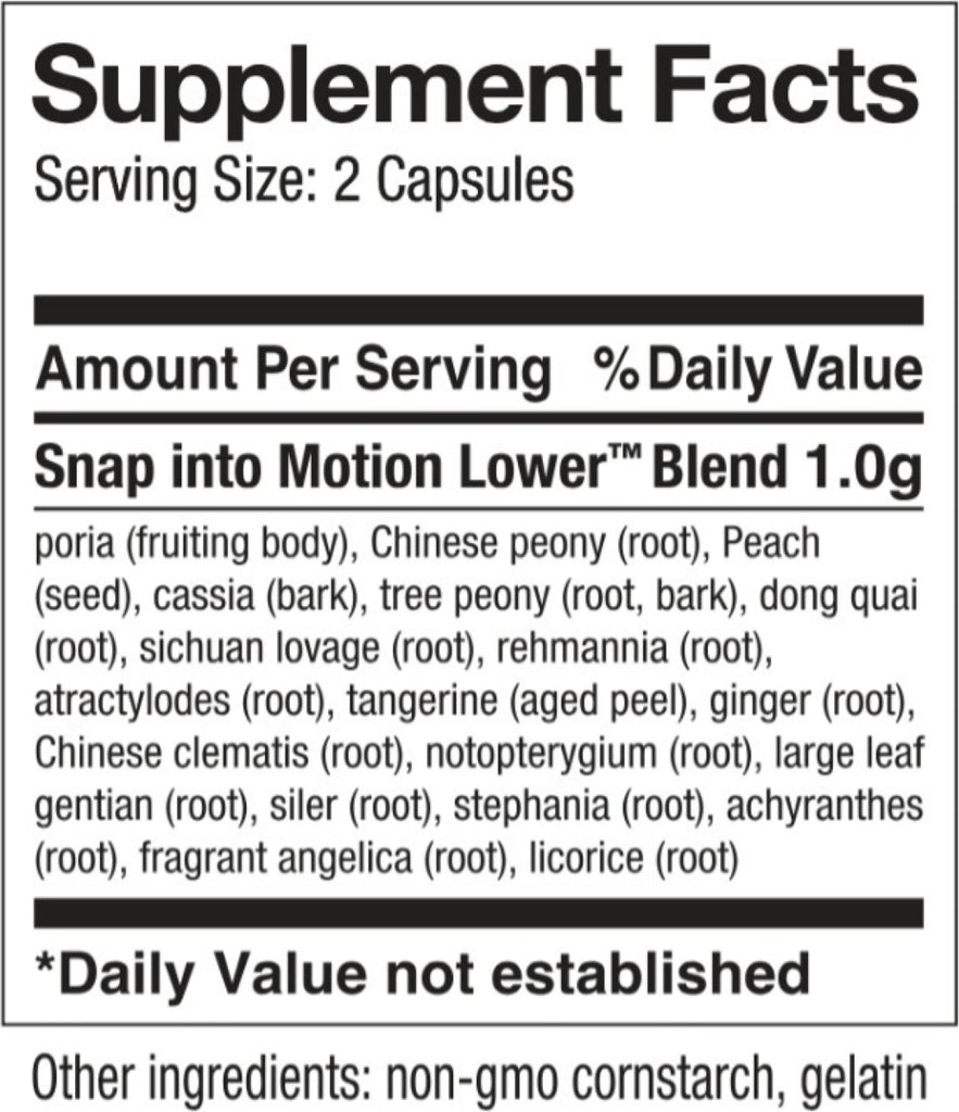 Due to the blood-moving action of the formula, Snap Into Motion Lower is contraindicated during pregnancy.  Consult a healthcare professional if using prescription blood thinners.