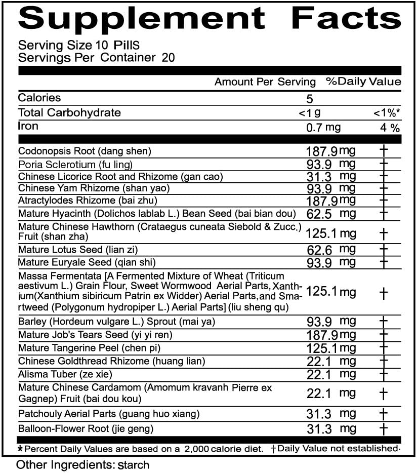 Codonopsis Root, Polyporus Sclerotium, Chinese Licorice Root and Rhizome, Chinese Yam Rhizome, Atractylodes Rhizome, Mature Hyacinth Bean Seed, Mature Chinese Hawthorn Fruit, Mature Lotus Seed, Mature Euryale Seed, Massa Fermentata, Barley Sprout, Mature Job's Tears Seed, Mature Tangerine Peel, Chinese Goldthread Rhizome, Alisma Tuber, Mature Chinese Cardamom Fruit, Patchouly Aerial Parts, Balloon-flower Root, and Starch.