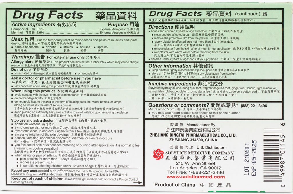 Apply this Chinese herbal medicated plaster to temporarily relieve minor aches and pains of muscles and joints due to simple backache, joints pain, strains, bruises and sprains.