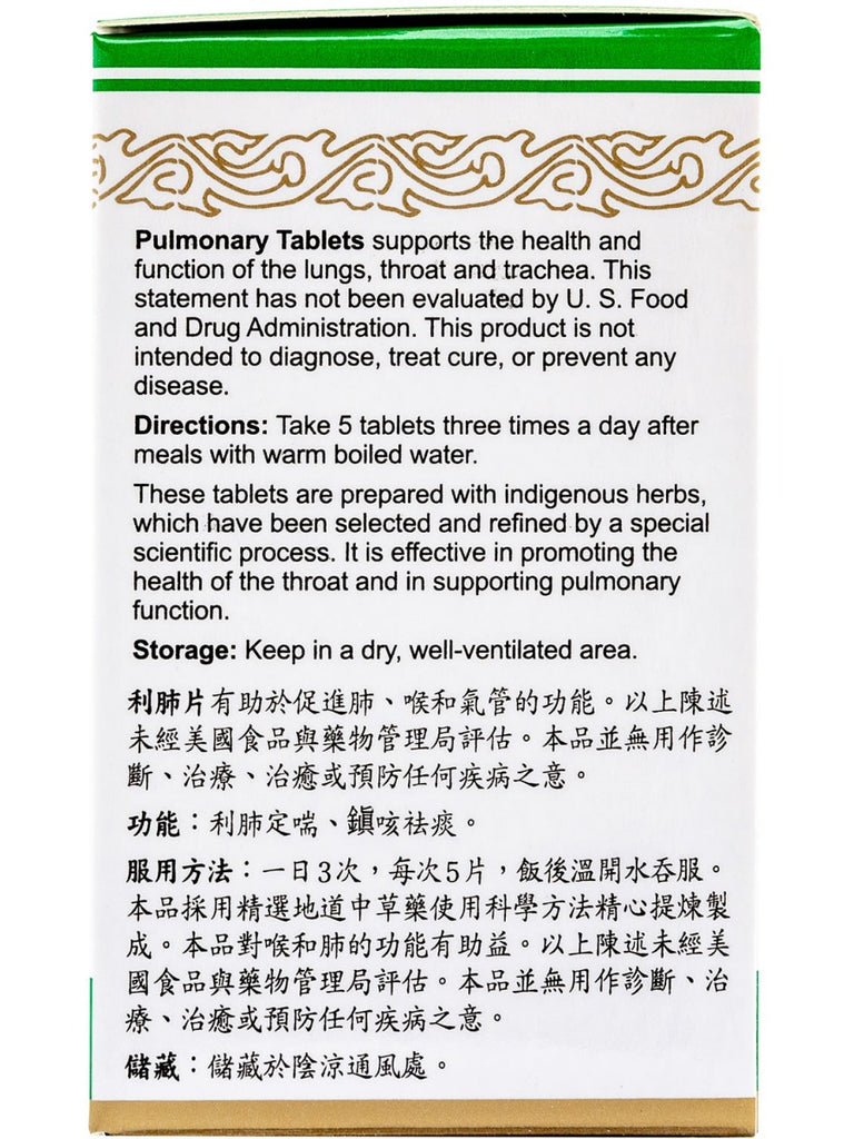 Supports the health and function of the lungs, throat and trachea. These statements have not been evaluated by Food and Drug Administration. This product is not intended to diagnose, treat, cure or prevent any disease. These tablets are prepared with indigenous herbs, which have been selected and refined by a special scientific process. It is effective in promoting the health of the throat and in supporting pulmonary function.