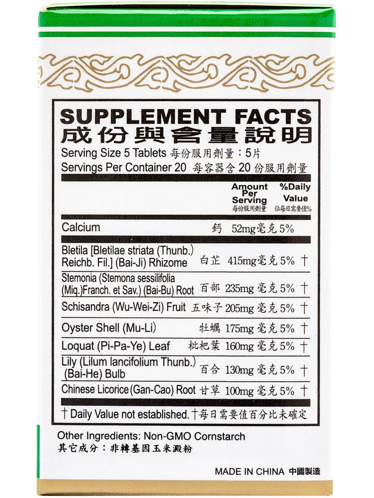 Active Ingredients: Calcium, Bletilla Rhizome, Stemonia Root, Schisandra Fruit, Oyster Shell, Loquat Leaf, Lily Bulb, Chinese Licorice Root, Gecko, Cordyceps Fungus