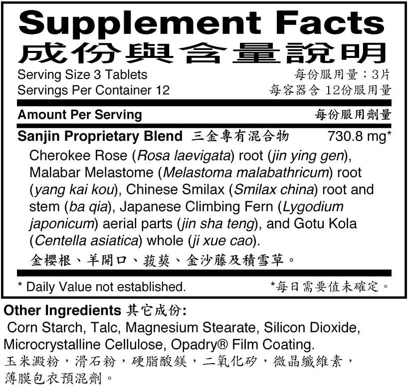 Active Ingredients: Sanjin Proprietary Blend - Cherokee Rose Rosa laevigata root jin ying gen, Malabar Melastome Melastoma malabathricum root yang kai kou, Chinese Smilax Smilax china root and stem ba qia, Japanese Climbing Fern Lygodium japonicum aerial parts jin sha teng, and Gotu Kola Centella asiatica whole.