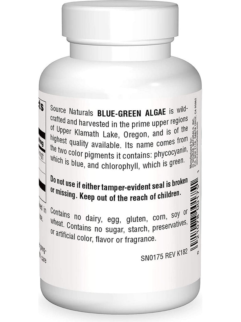 Source Naturals Blue-Green Algae is wildcrafted and harvested in the prime upper regions of Upper Klamath Lake, Oregon, and is of the highest quality available. Its name comes from the two color pigments it contains: phycocyanin, which is blue, and chlorophyll, which is green.