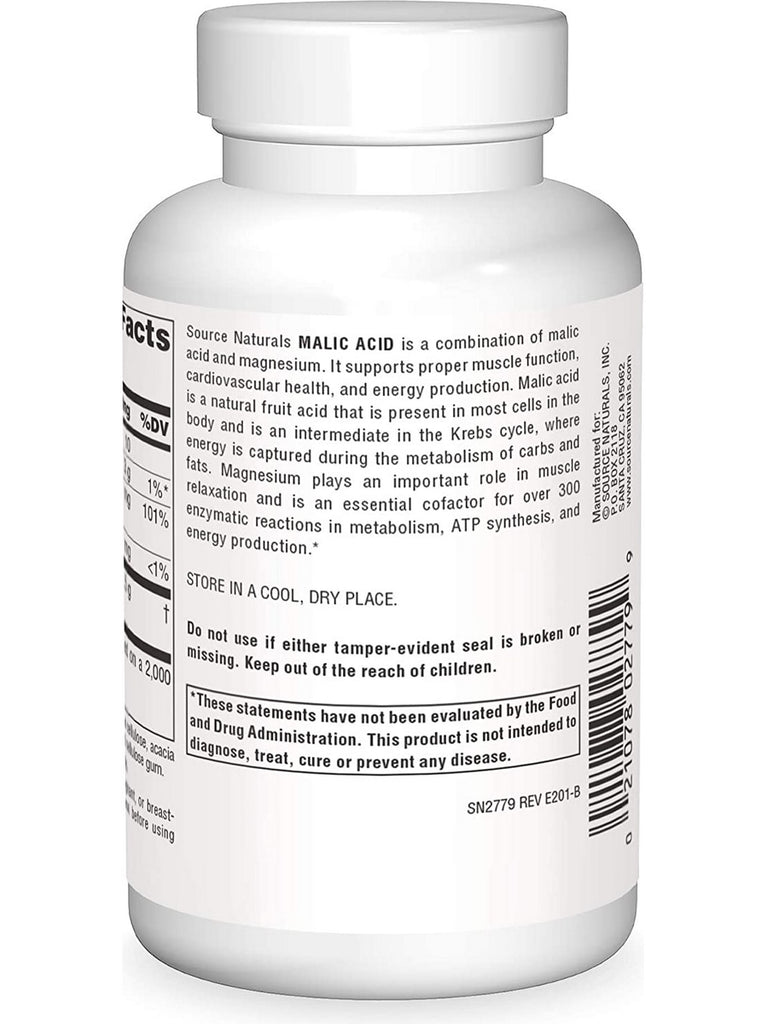 Source Naturals Malic Acid is a combination of malic acid and magnesium. It supports proper muscle function, cardiovascular health, and energy production. Malic acid is a natural fruit acid that is present in most cells in the body and is an intermediate in the Krebs cycle, where energy is captured during the metabolism of carbs and fats. Magnesium plays an important role in muscle relaxation and is an essential cofactor for over 300 enzymatic reactions in metabolism, ATP synthesis, and energy production.