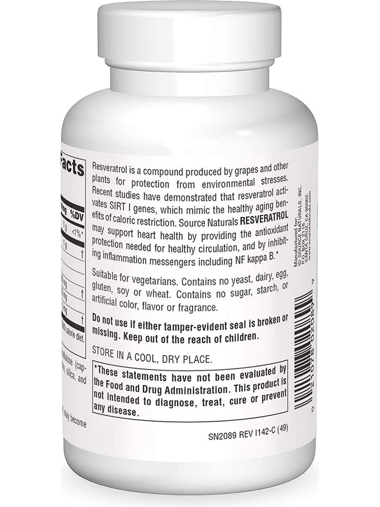 Resveratrol is a compound produced by grapes and other plants for protection from environmental stresses. Recent studies have demonstrated that resveratrol activates SIRT I genes, which mimic the healthy aging benefits of caloric restriction. Source Naturals Resveratrol may support heart health by providing the antioxidant protection needed for healthy circulation, and by inhibiting inflammation messengers including NF kappa B.