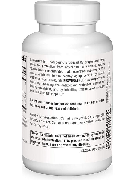 Resveratrol is a compound produced by grapes and other plants for protection from environmental stresses. Recent studies have demonstrated that resveratrol activates SIRT I genes, which mimic the healthy aging benefits of caloric restriction. Source Naturals Resveratrol may support heart health by providing the antioxidant protection needed for healthy circulation, and by inhibiting inflammation messengers including NF kappa B.
