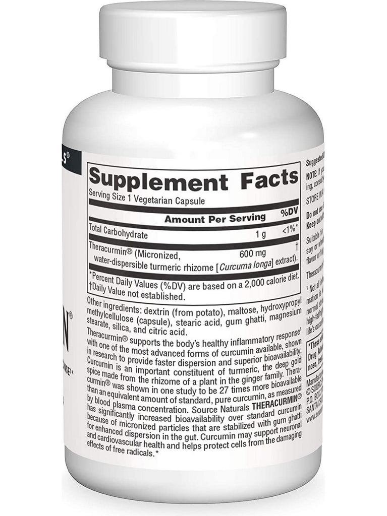 Theracurmin® supports the body’s healthy inflammatory response1 with one of the most advanced forms of curcumin available, shown in research to provide faster dispersion and superior bioavailability. Curcumin is an important constituent of turmeric, the deep gold spice made from the rhizome of a plant in the ginger family. Theracurmin® was shown in one study to be 27 times more bioavailable than an equivalent amount of standard, pure curcumin, as measured by blood plasma concentration. Source Naturals Theracurmin® has significantly increased bioavailability over standard curcumin because of micronized particles that are stabilized with gum ghatti for enhanced dispersion in the gut. Curcumin may support neuronal and cardiovascular health and helps protect cells from the damaging effects of free radicals.