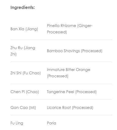 Ban Xia (Jiang) (Pinellia Rhizome (Ginger-Processed)), Zhu Ru (Jiang Zhi) (Bamboo Shavings (Processed)), Zhi Shi (Fu Chao)(Immature Bitter Orange (Processed)), Chen Pi (Chao) (Tangerine Peel (Processed)), Gan Cao (Mi) (Licorice Root (Processed)), Fu Ling (Poria).