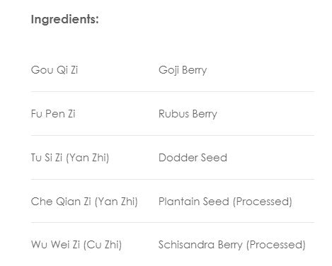 Gou Qi Zi (Goji Berry), Fu Pen Zi (Rubus Berry), Tu Si Zi (Yan Zhi) (Dodder Seed), Che Qian Zi (Yan Zhi) (Plantain Seed (Processed)), Wu Wei Zi (Cu Zhi) (Schisandra Berry (Processed)).