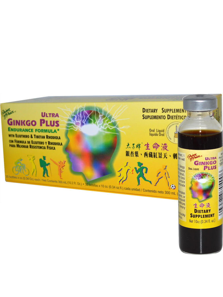 Prince of Peace Ultra Ginkgo Plus Endurance Formula supports the body's energy and immune system. Prince of Peace Ultra Ginkgo Plus Endurance Formula with Eleuthero and Tibetan Rhodiola is a non-alcoholic herbal supplement. Ultra Ginkgo Plus Endurance Formula can be a good complement to an athlete's training program. Ginkgo Biloba has been taken for thousands of years throughout Asia. It has traditionally been used to support brain functions. Tibetan Rhodiola grows in remote high altitudes in Tibet and Russia. It is ideal for pilots, athletes, and mountain climbers to increase physical work output. Eleuthero is renowned for its ability to boost energy and promote balance.