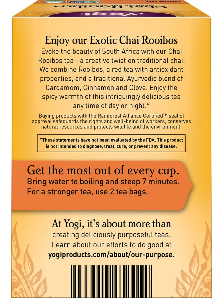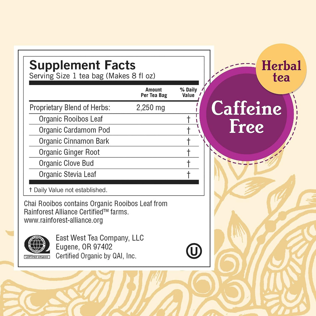 This Chai Rooibos Tea is a creative twist on traditional chai, with caffeine-free Organic Rooibos, the red tea of South Africa. A traditional, enchanting combination of Cardamom, Cinnamon and Clove combine to add warmth and intriguing flavor. Enjoy Chai Rooibos any time of the day-hot or cold! Caffeine Free.