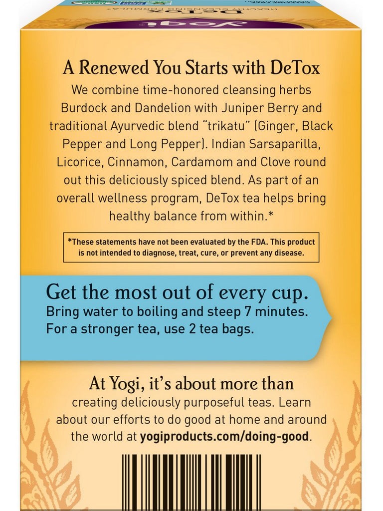 This tea includes the traditional Ayurvedic cleansing blend called "trikatu" (Ginger, Black Pepper, and Long Pepper) supports blood flow, while Indian Sarsaparilla adds the spicy flavor. When combined with an overall wellness program, DeTox can help bring healthy balance from within. Caffeine Free.