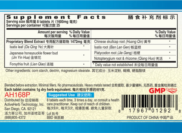 A proprietary blend of: Flos Lonicerae Japonicae (Jin Yin Hua), Fructus Forsythiae Suspensae (Lian Qiao), Radix Scutellariae Baicalensis (Huang Qin), Radix Isatidis (Ban Lan Gen), Folium Isatidis (Da Qing Ye), Radix Platycodi Grandiflori (Jie Geng), Rhizoma et Radix Notopterygii (Qiang Huo).
