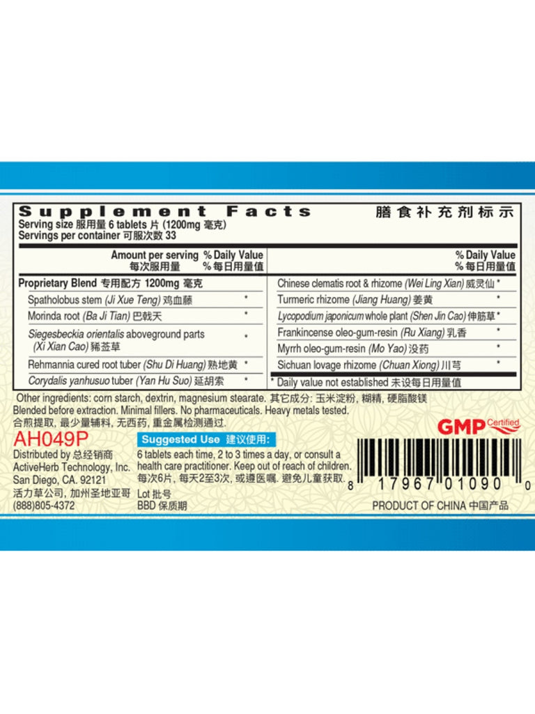 A proprietary blend of: Resina Boswelliae Carterii (Ru Xiang), Resina Commiphorae Myrrhae (Mo Yao), Caulis Spatholobi (Ji Xue Teng), Rhizoma Corydalis (Yan Hu Suo), Radix Morindae Officinalis (Ba Ji Tian), Herba Siegesbeckiae (Xi Xian Cao), Radix Clematidis (Wei Ling Xian), Rhizoma Curcumae Longae (Jiang Huang), Radix Rehmanniae Preparata (Shu Di huang), Rhizoma Ligustici Chuanxiong (Chuan Xiong), Herba Lycopodii (Shen Jin Cao).
